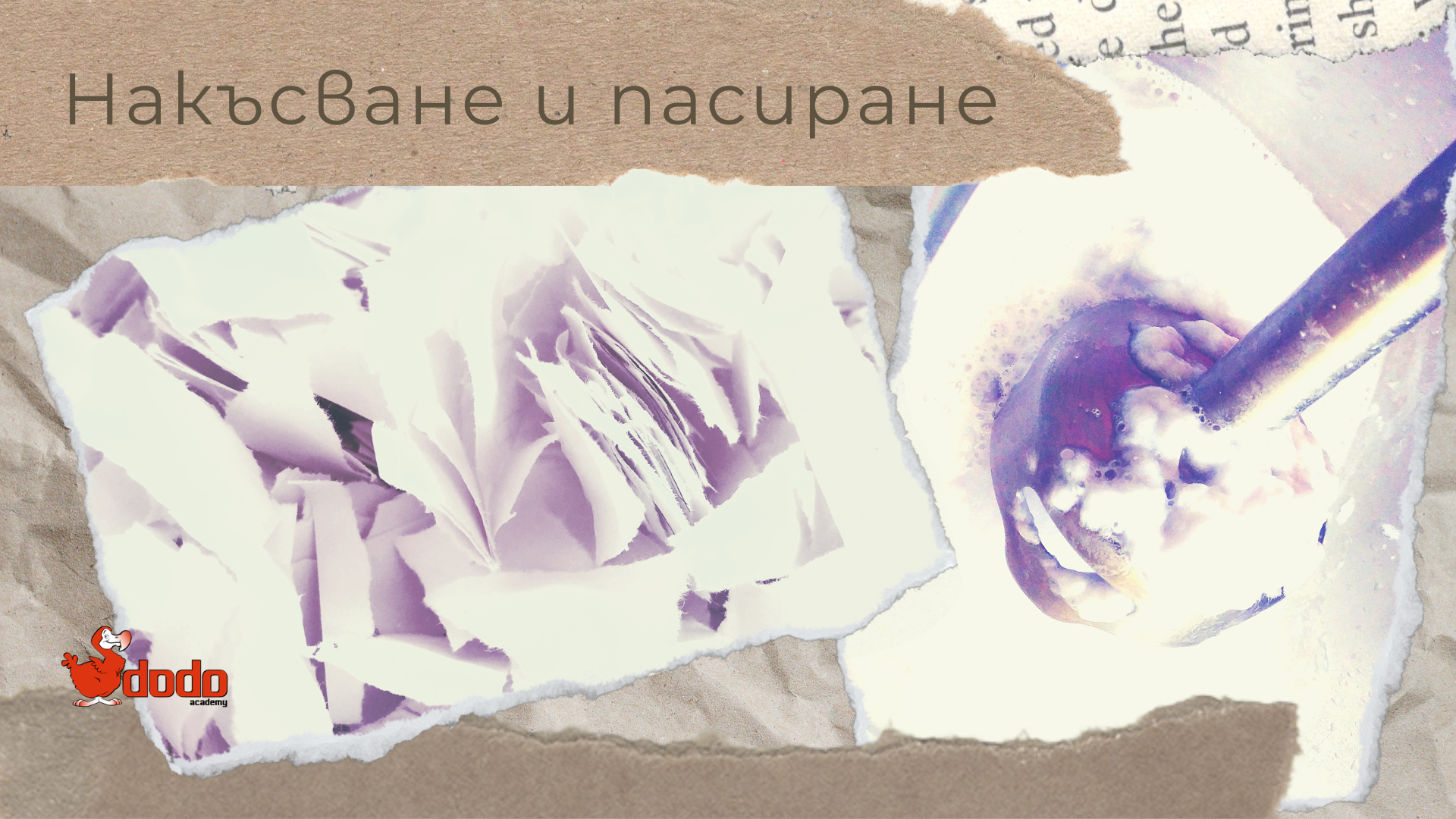 В дълбок и висок съд поставяме накъсаните хартиени парченца и ги заливаме с гореща вода. Колкото повече вода има, толкова хартията става по фина. За нашата цел, обаче, това не беше необходимо, така че щедро си напълнихме съда с хартия. Желателно е хартията да кисне във водата поне 24 часа. Е, ние не сме чак толкова търпеливи! Идва ред на пасатора. С негова помощ раздробяваме парченцата, докато се получи гъста каша, наречена пулпа.